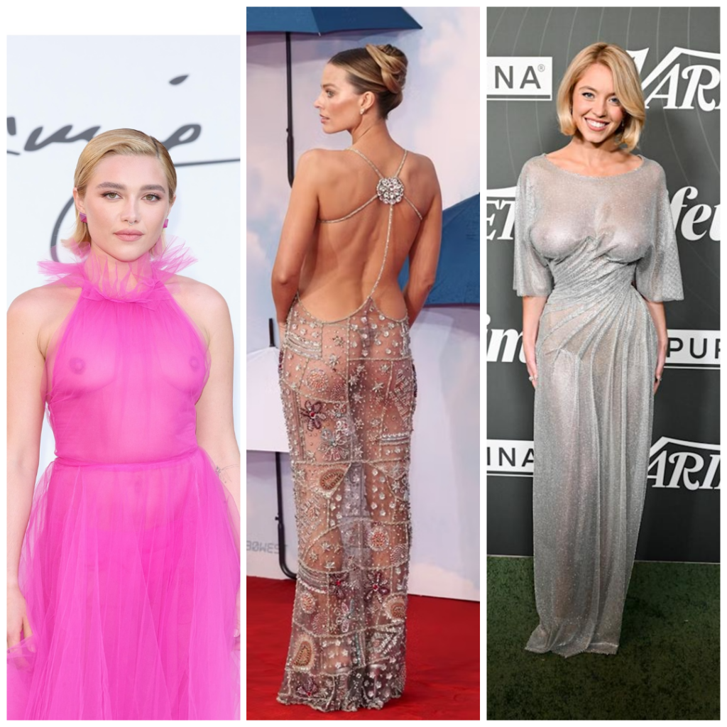 O elenco de celebridades que abraçou a tendência em 2025 inclui nomes como Sydney Sweeney, Florence Pugh, Margot Robbie, Dakota Johnson, Millie Bobby Brown e Demi Moore, que usaram vestidos transparentes em eventos de alto impacto, de tapetes vermelhos a estreias cinematográficas, gerando ampla cobertura e conversas em torno da moda como performance pública. Já Kendall Jenner, na Paris Fashion Week, conduziu o formato para o universo couture ao desfilar um modelo Schiaparelli que incorpora transparência e arte sartorial com autoridade. Esses momentos refletem um movimento no qual o naked dress não apenas evidencia o corpo em si, mas a relação entre o sujeito e sua imagem, com implicações sobre poder, visibilidade e agência.