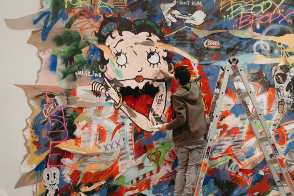 O centro da exposição é um muro de chicletes — sim, uma instalação inteira coberta por contribuições mastigadas de visitantes e amigos, incluindo, como Brody conta em papo com a revista Cultured, um chiclete em formato de coração trazido por Jackie Chan, que foi prontamente roubado. Ao redor, obras da série “Vermin” se misturam a respingos de decadência industrial, referências à cultura pop e reflexões sobre os excessos americanos. A trilha sonora original, composta pelo próprio Brody, ecoa pelo espaço — música que costura fragmentos de sons urbanos, reggae, hip hop sombrio e slogans publicitários.