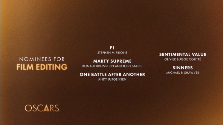 Os indicados deste ano a Melhor Montagem — todos também concorrendo a Melhor Filme — são “F1”, “Marty Supreme”, “Uma Batalha Após a Outra”, “Pecadores” e “Valor Sentimental”. São todos trabalhos de edição primorosos e que ajudam formatar filmes longos aferindo-lhes coesão narrativa, propositura dramática e energia.