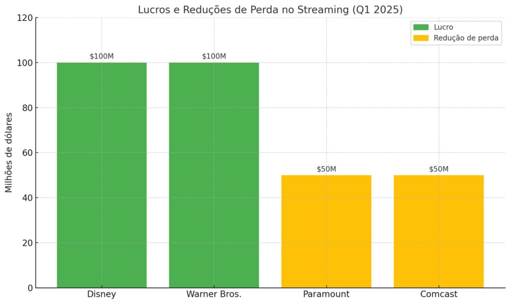 Disney e Warner Bros. Discovery lideraram com lucros expressivos, enquanto Paramount Global e o Peacock, da Comcast, reduziram significativamente suas perdas (conforme mostra o gráfico abaixo).