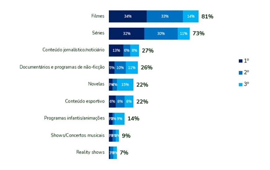 Quando o assunto é conteúdo, os filmes são a opção preferida absoluta para 81% dos entrevistados, seguidos de perto por séries (73%). Em um distante terceiro lugar, aparecem conteúdos jornalísticos ou noticiários (27%) e documentários (26%), indicando que as plataformas são majoritariamente associadas ao entretenimento. Novelas (22%), esportes (22%) e programas infantis (14%) têm espaço significativo, enquanto reality shows (7%) e shows musicais (9%) ficam com a menor fatia de interesse.