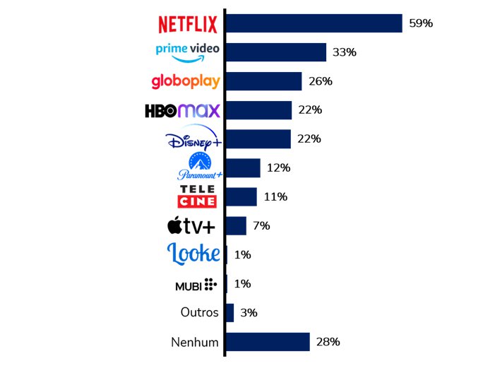 O cenário, porém, é de pluralidade. O Prime Video aparece como forte concorrente, sendo assinado por 33% do público e citado como uma das três melhores plataformas por 48% dos usuários, com especial popularidade na classe B (61%). O Globoplay ocupa a terceira posição (26% de assinaturas), com maior apelo entre o público maduro – baby boomers (46%) e Geração X (43%) – e moradores do Sudeste (40%). HBO Max e Disney+ completam o top 5, empatadas com 22% cada.