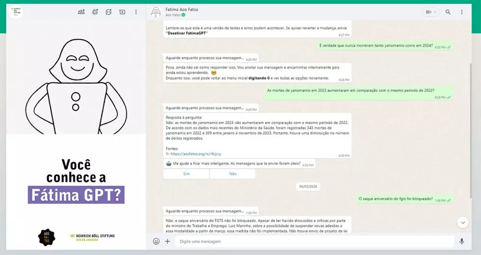 Outra iniciativa é o chatbot Maria Valente, desenvolvido pela organização Toda Cidadã para oferecer informações acessíveis sobre direitos das mulheres por meio de aplicativos de mensagens. No campo da checagem de informações, a organização jornalística Aos Fatos criou a FátimaGPT, robô que utiliza inteligência artificial generativa para verificar conteúdos suspeitos e combater desinformação.