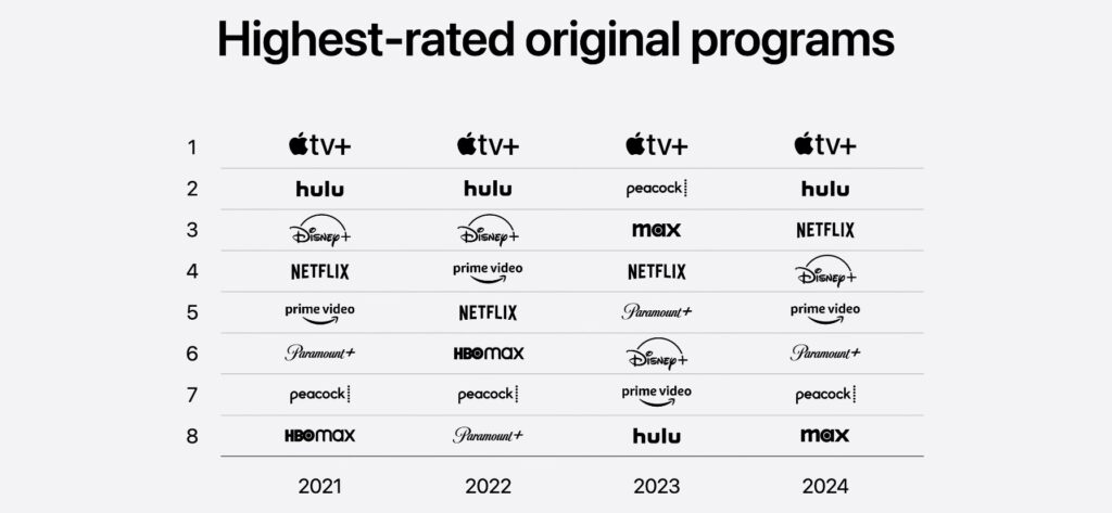 A segunda e a terceira posições veem uma intenção variação com Hulu, Netflix, MAX e Disney+ disputando ano a ano. Essa estabilidade reforça a percepção de qualidade premium dos originais da Apple, o que se ainda não foi suficiente para massificar sua plataforma, certamente contribui para seu soft power.