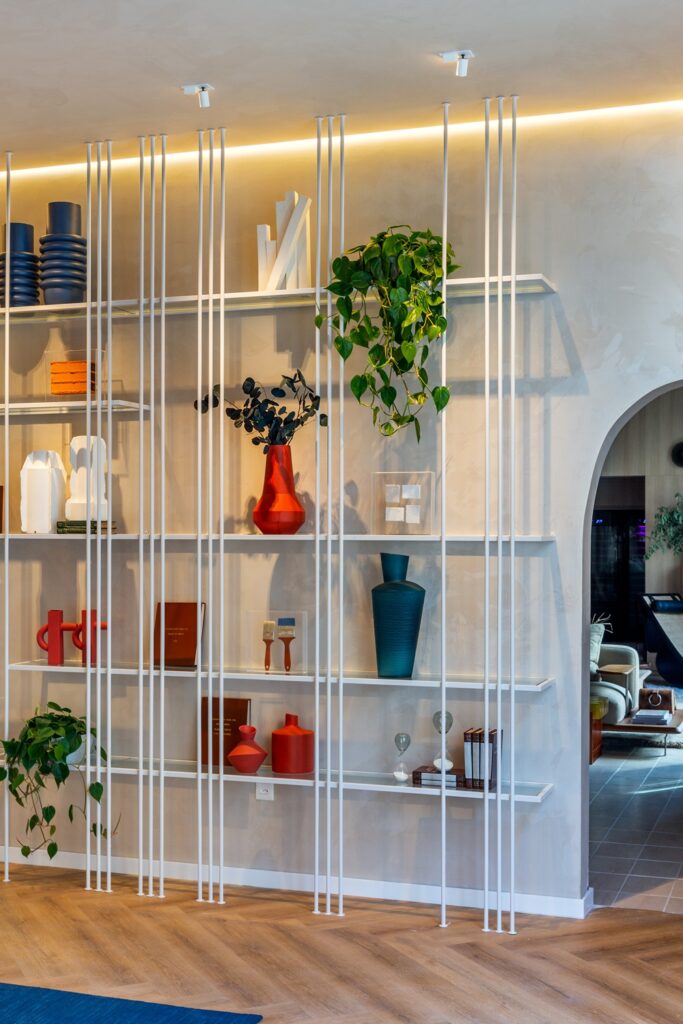 “Queríamos que o espaço traduzisse a essência da construção civil com arte, memória e significado”, afirma Marice Gandin, que também é sócia-proprietária da construtora. Para isso, ela e Giulia desenvolveram estantes e vitrines com caixas de acrílico que abrigam materiais brutos e objetos utilizados diretamente na obra, como pincéis, tijolos e amostras de revestimentos. “Cada prédio que a gente constrói é como um pequeno ponto de realização plantado”, completa Marice.